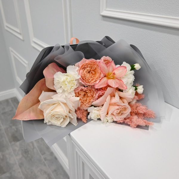 Нежный букет в персиковой цветовой гамме. В составе французские розы, кустовая пионовидная роза, похожая на пион, и сортовая гвоздика.Флористы студии Цветочный Этикет собрали его из самых свежих цветов, тщательно продумав состав. Букет готов удивлять красотой своего получателя! … Показать ещёСтанет идеальным подарком для любимой женщины, дочке или мамы, на День Рождения, юбилей, свадьбу и другие торжественные мероприятия. С букетом вы получите конверт с открыткой, в которой мы напишем любое пожелание, инструкцию свежести и средство для продления жизни срезанных цветов.